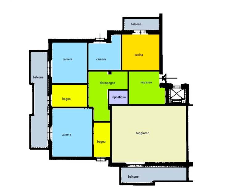 L'appartamento, posto al secondo piano e servito da ascensore, vanta una superficie di circa 140 mq. La disposizione interna prevede un ampio ingresso che introduce direttamente nella zona giorno, composta da un grande soggiorno luminoso dotato di balcone e da una cucina abitabile anch'essa con accesso a un secondo balcone.